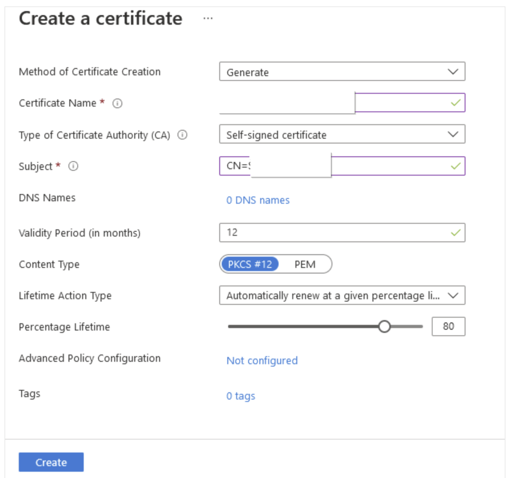 The certificate is created in the key vault you selected with the name format hostname-instancename-uniquenumber as shown below
